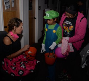 A volunteer in a Deadpool costume (Right) greets a young Spiderman (Left) during the 5th Annual Trunk-or-Treat event at Travis Air Force Base, Calif., Oct. 28, 2016. More than 2,000 people attended the event which provided a safe place for military families to enjoy Halloween festivities. (U.S. Air