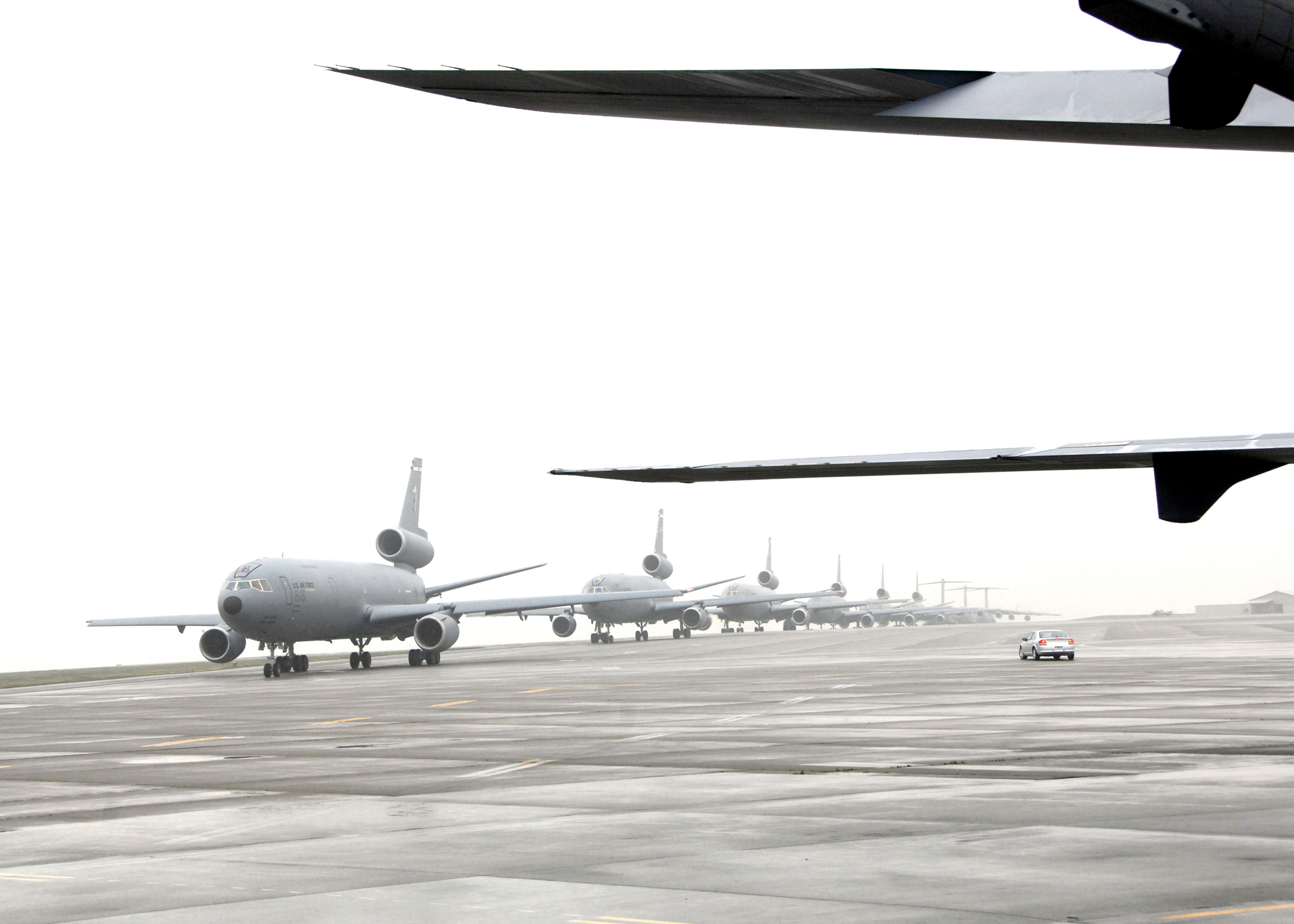 On 21 December 2009 Travis Air Force Base executed a mass aircraft launch. Nine cargo aircraft took part in the exercise. Including six KC-10 Extender's, two C-17 Globemaster's and one C-5 Galaxy. (U.S. Air Force photo by Civ/Amanda Lopez)