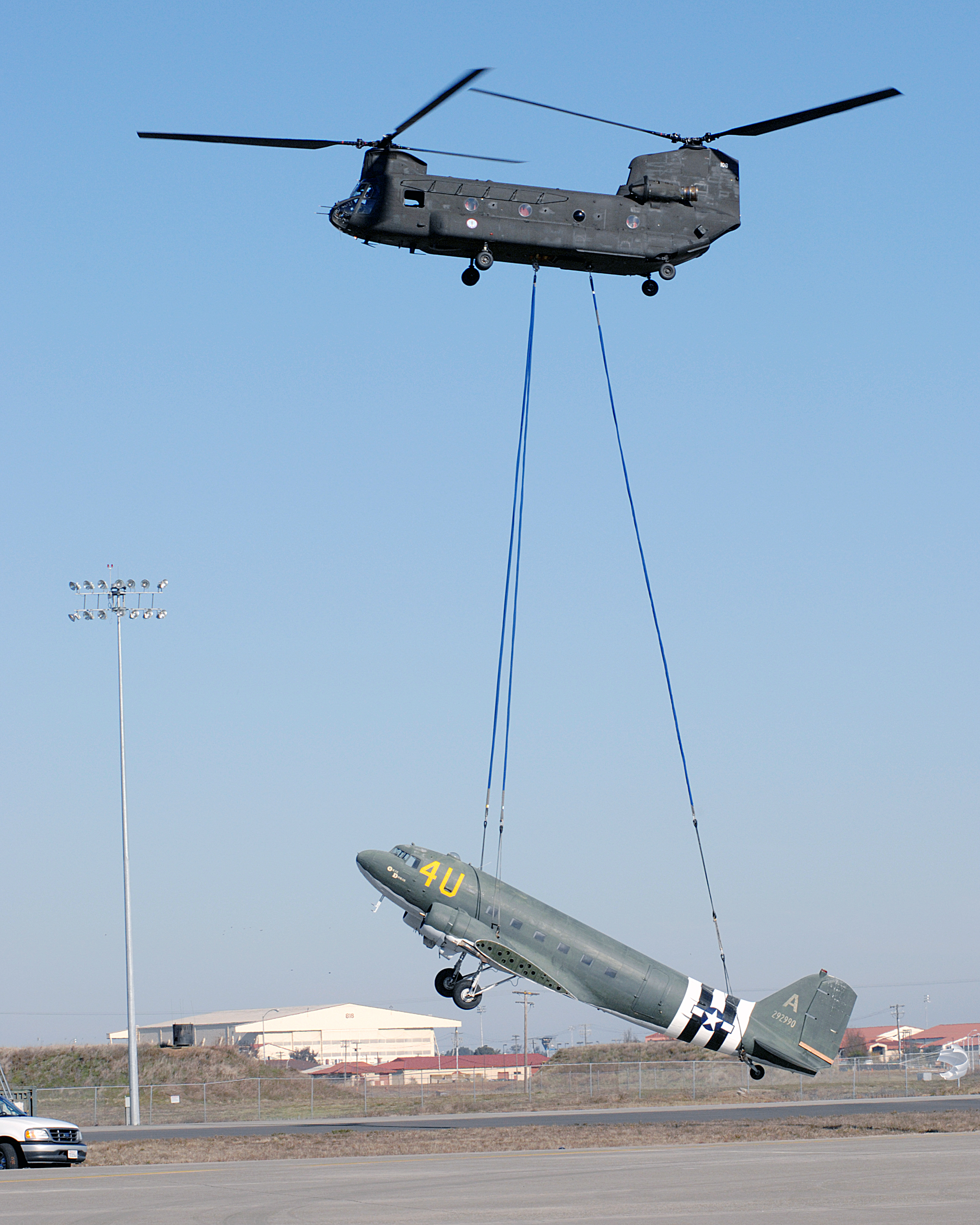Members of the California Air National Guard provide airlift with a CH-47 Chinook helicopter in relocating a C-47 Skytrain aircraft from Nut Tree Regional Airport in Vacaville, Calif. to Travis AFB. The C-47 was donated by Mr. Duncan Miller of Vacaville, Calif. to the Jimmy Doolittle Air and Space Museum Foundation. The C-47 will be restored and displayed along with the 30 other aircraft in the museum's collection. This aircraft has a storied history having been one of the aircraft to participate in the invasion of Normandy during World War II. (Photo by David W. Cushman, DAFC)