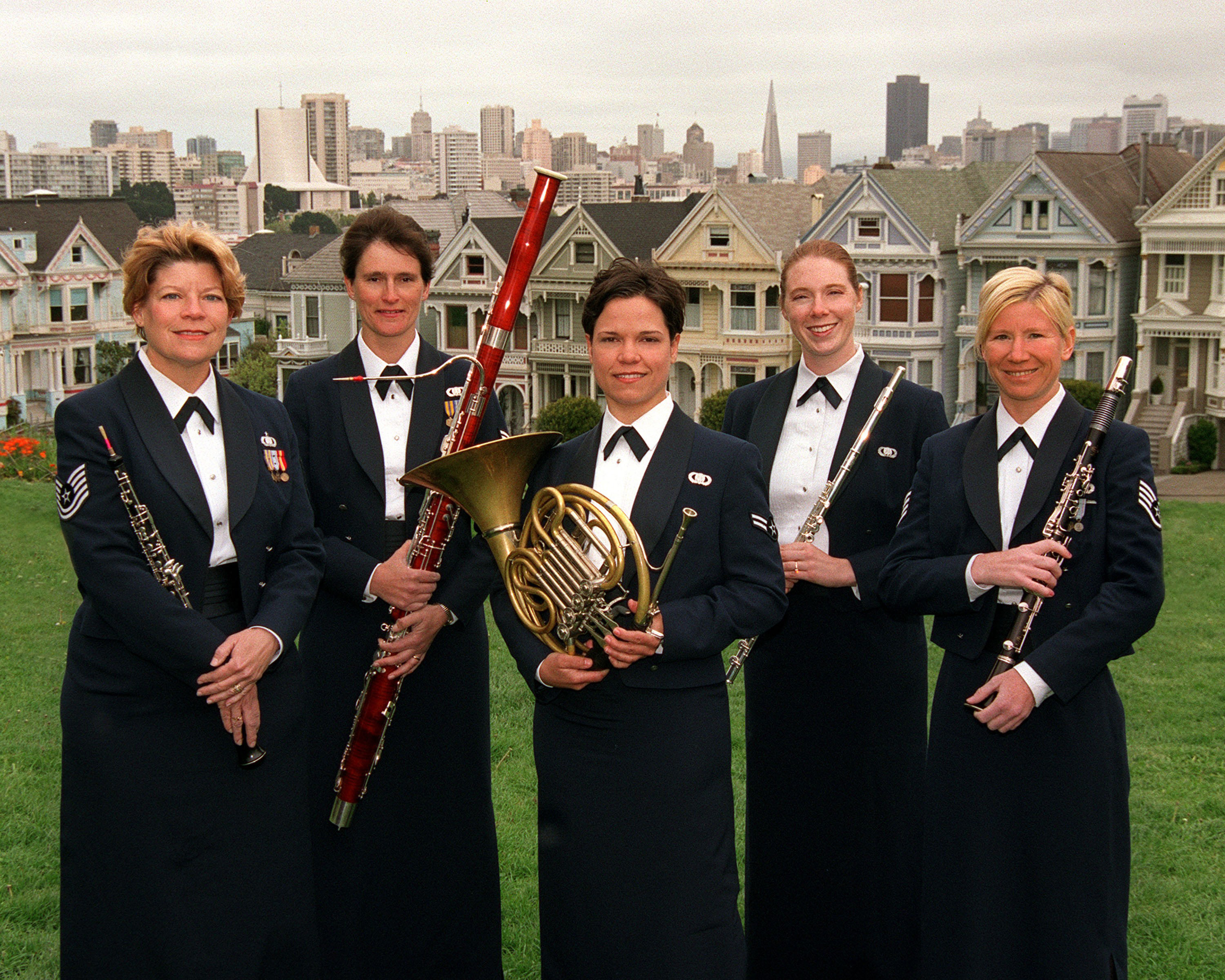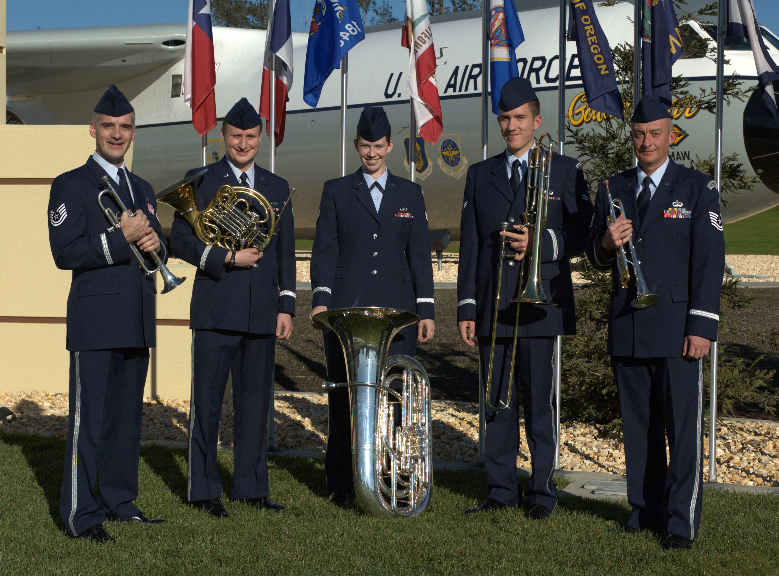 Members of the USAF Band of the Golden West's Brass Quintet perform for the 60th Air Mobility Wing members Dec. 13. (From left to right), Tech. Sgt. Brian Wood, Airman 1st Class Ryan Williams, Senior Airman Jill Corbett, Senior Airman Edwin Ochsner and Airman 1st Class James Lantz visited different units at Travis to spread some holiday cheer. Team Travis members were invited to sing carols as the band played. (U.S. Air Force photo by Staff Sgt. Candy Knight)