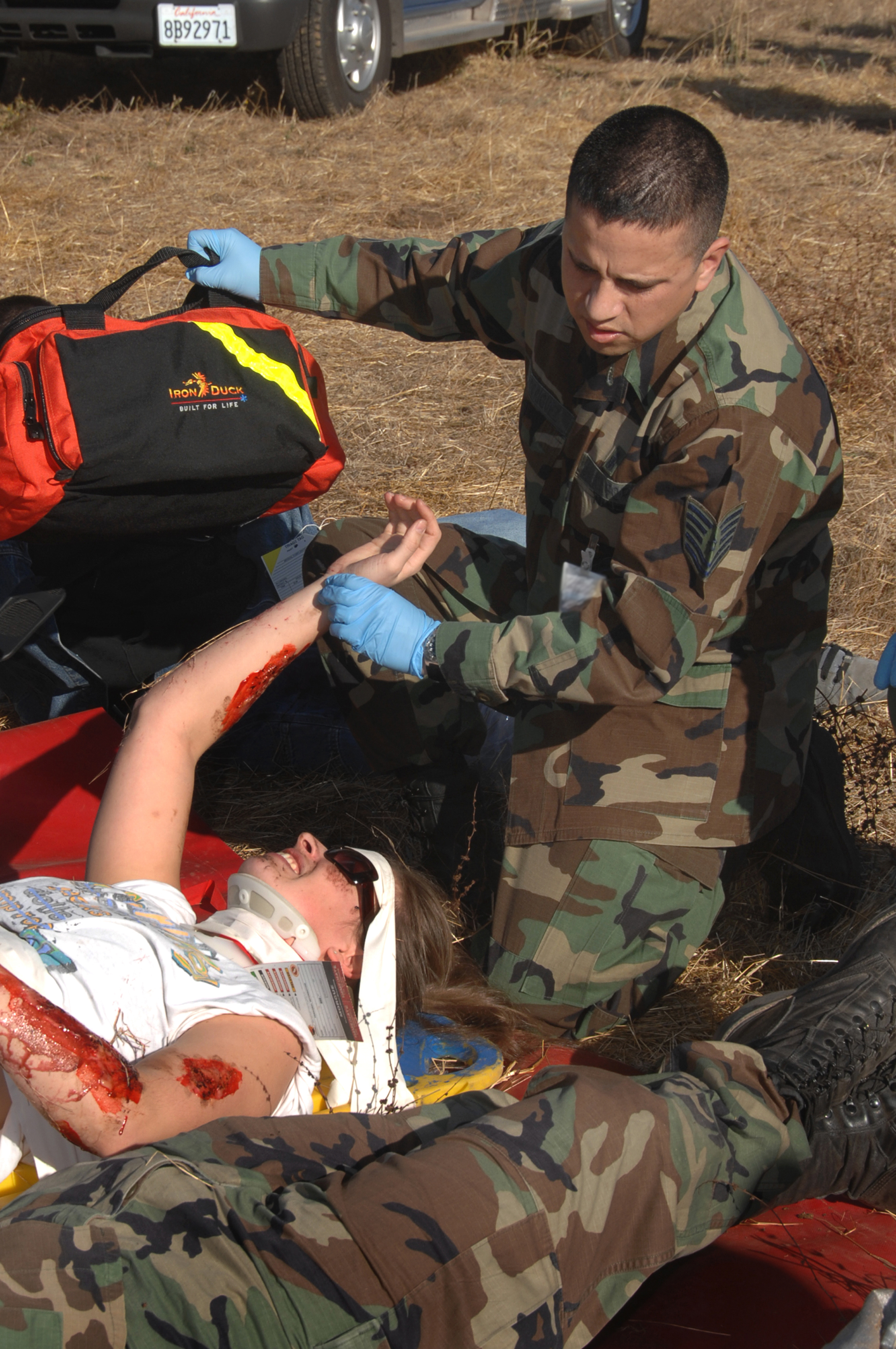 Tech. Sgt. Edward Rodriguez, an Independent Duty Medical Technician from the 60th Medical Squadron, checks the vital signs of victim Senior Airman Morgan Cockran, member of the 60th Medical Operation Squadron during Exercise "Aircraft Down," a joint exercise between Travis Air Force Base, Calif., and the surrounding local community first responders held Oct. 19. The exercise simulated a C-5 Galaxy crash. More than 350 people and 32 off-base agencies took part in the exercise. (Travis Air Force Base, Calif. Released)