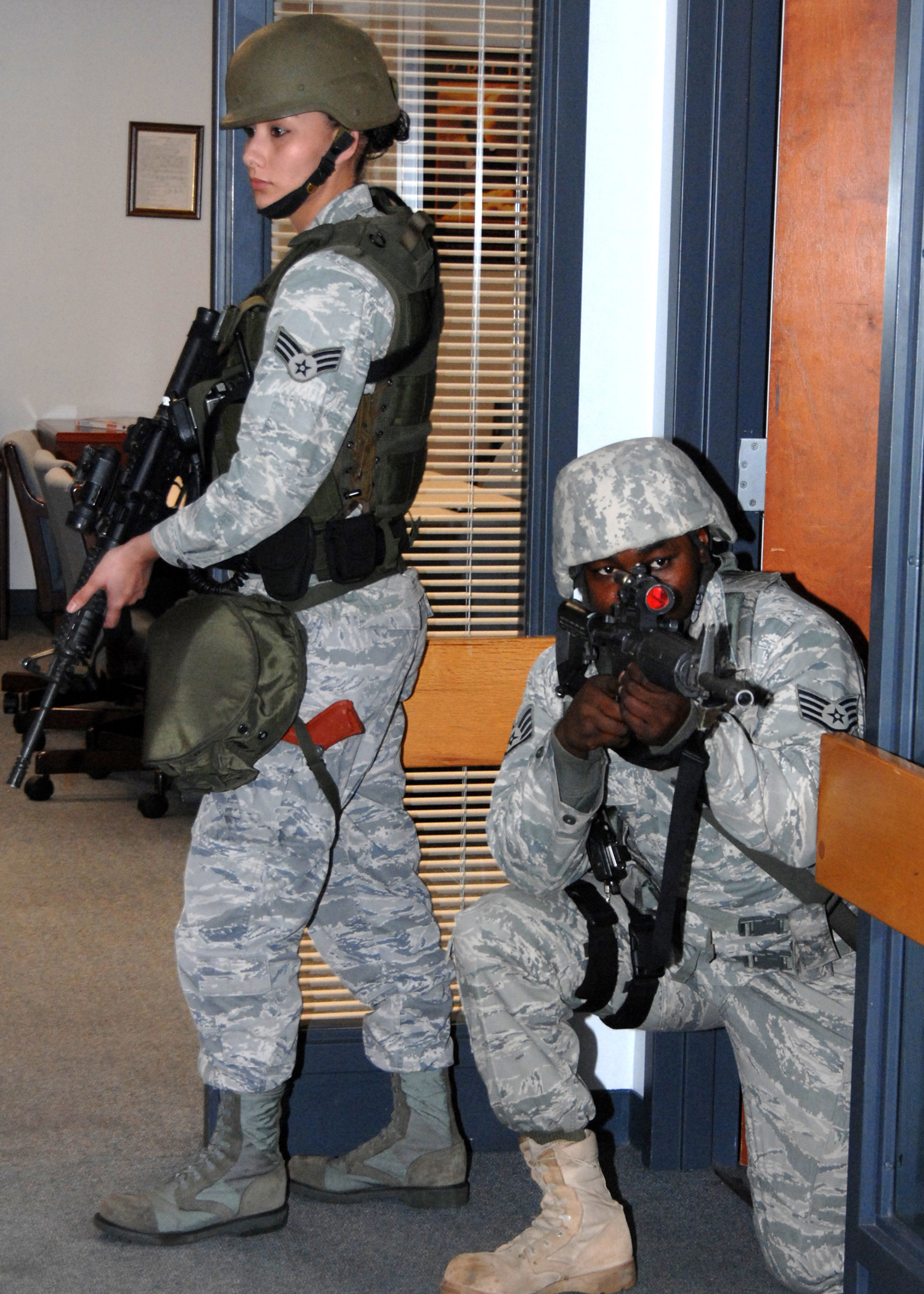Standing, Senior Airman Michelle Fricks and Staff Sergeant Tavarus Hartman provide security while additional emergency response personal clear a room during a simulated active shooter-exercise on 25 January, 2010 at Travis Air Force Base, California. Both members of the 60th Security Forces Squadron. (U.S. Air Force photo by Civ/Nan Wylie)