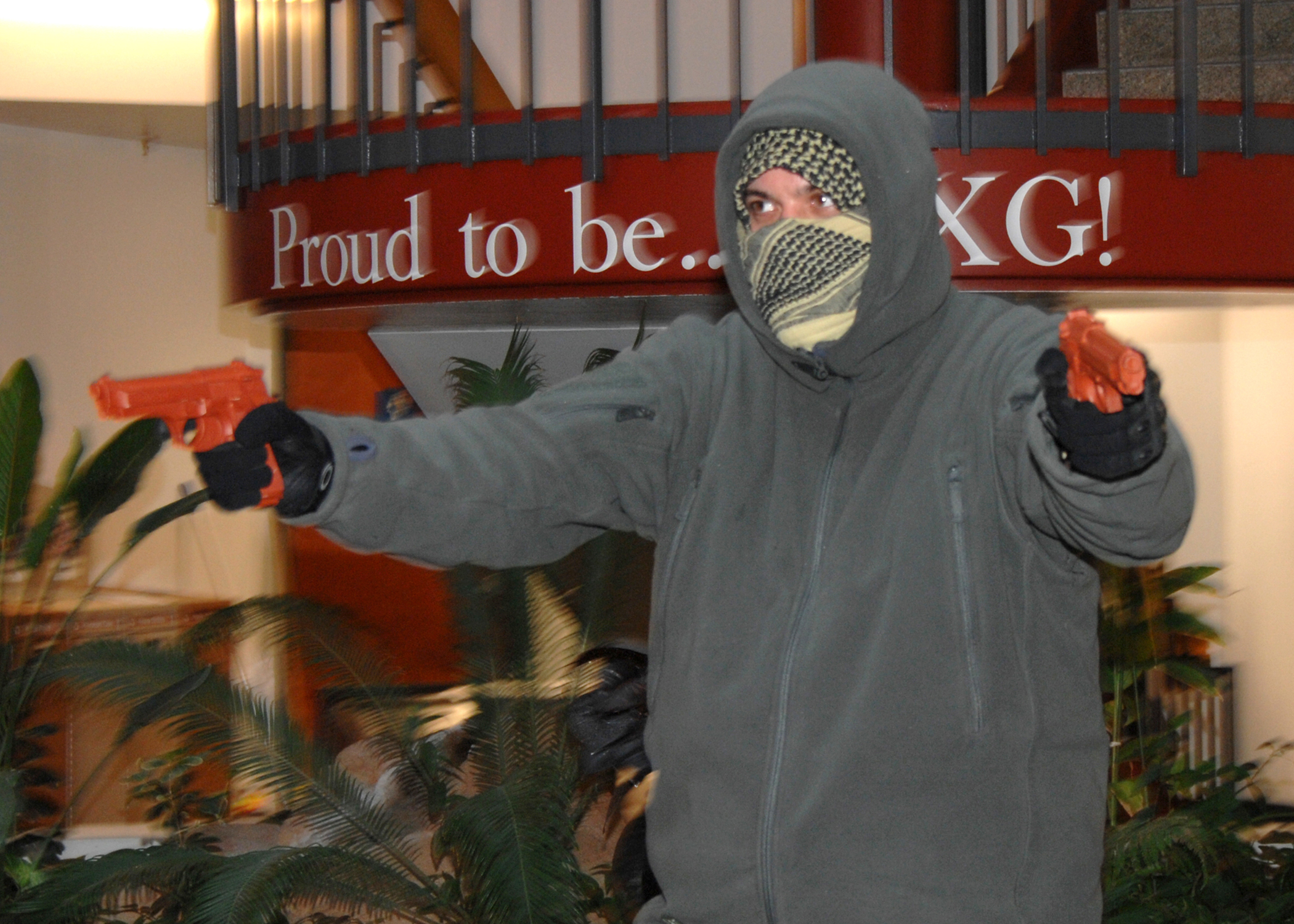 Douglas Delcampo (Civilian) member of the 60th Security Forces Squadron portrays a gunman during an emergency response exercise at Travis Air Force Base, California on 25 January 2010. (U.S. Air Force photo by Civ/Nan Wylie)