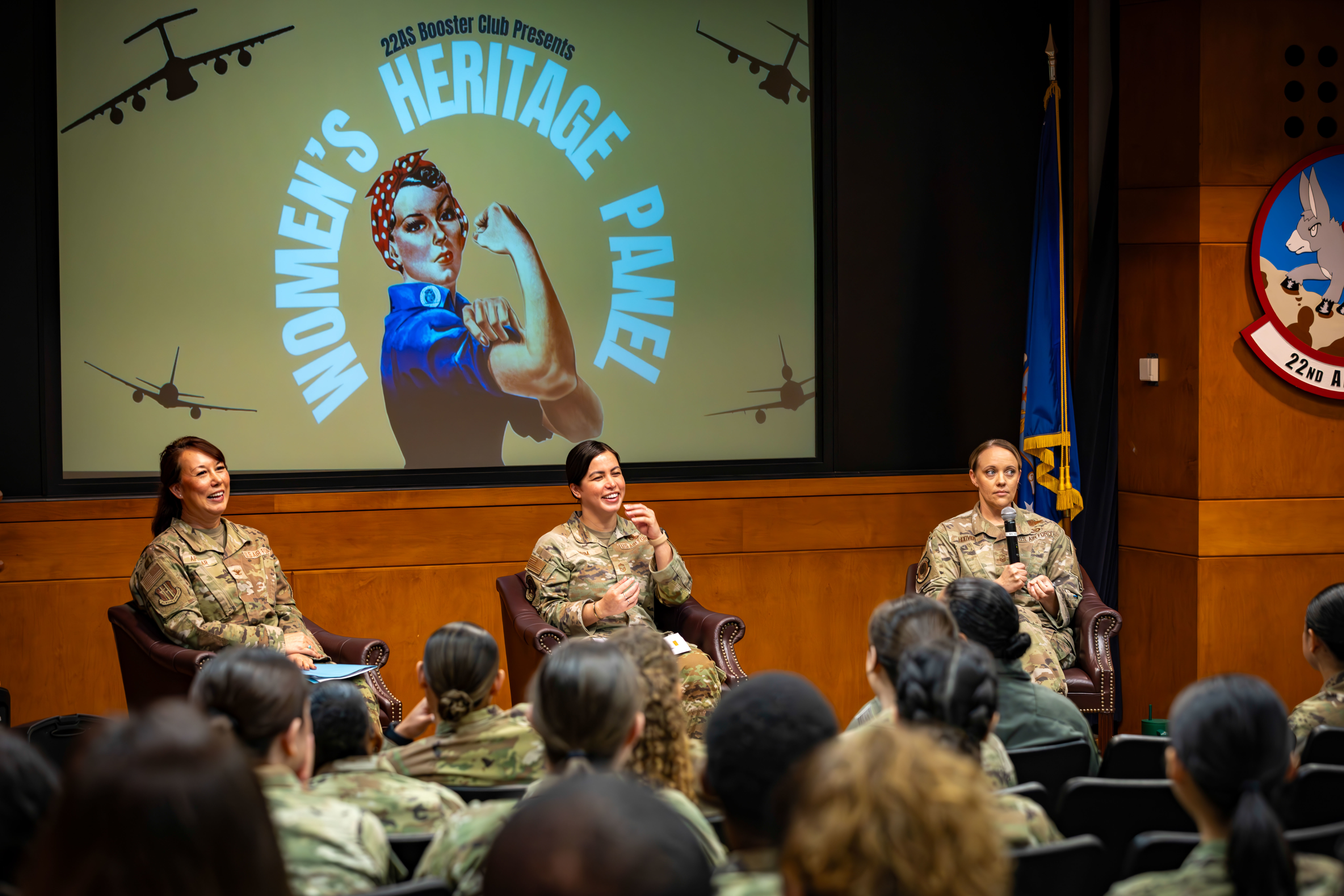 U.S. Airmen participate in the Women’s Heritage Exposition and Professional Development Q&A at Travis Air Force Base, California, March 29, 2024. The professional development Q&A portion of the event featured several installation leaders that included U.S. Air Force Col. Elizabeth Aptekar (left), 60th Mission Support Group commander, Chief Master Sgt. Melanie Grim, 860th Aircraft Maintenance Squadron senior enlisted leader, and Master Sgt. Erin Hoover, 60th Medical Diagnostics and Therapeutics Squadron first sergeant. (U.S. Air Force photo by Solomon Navarro)
