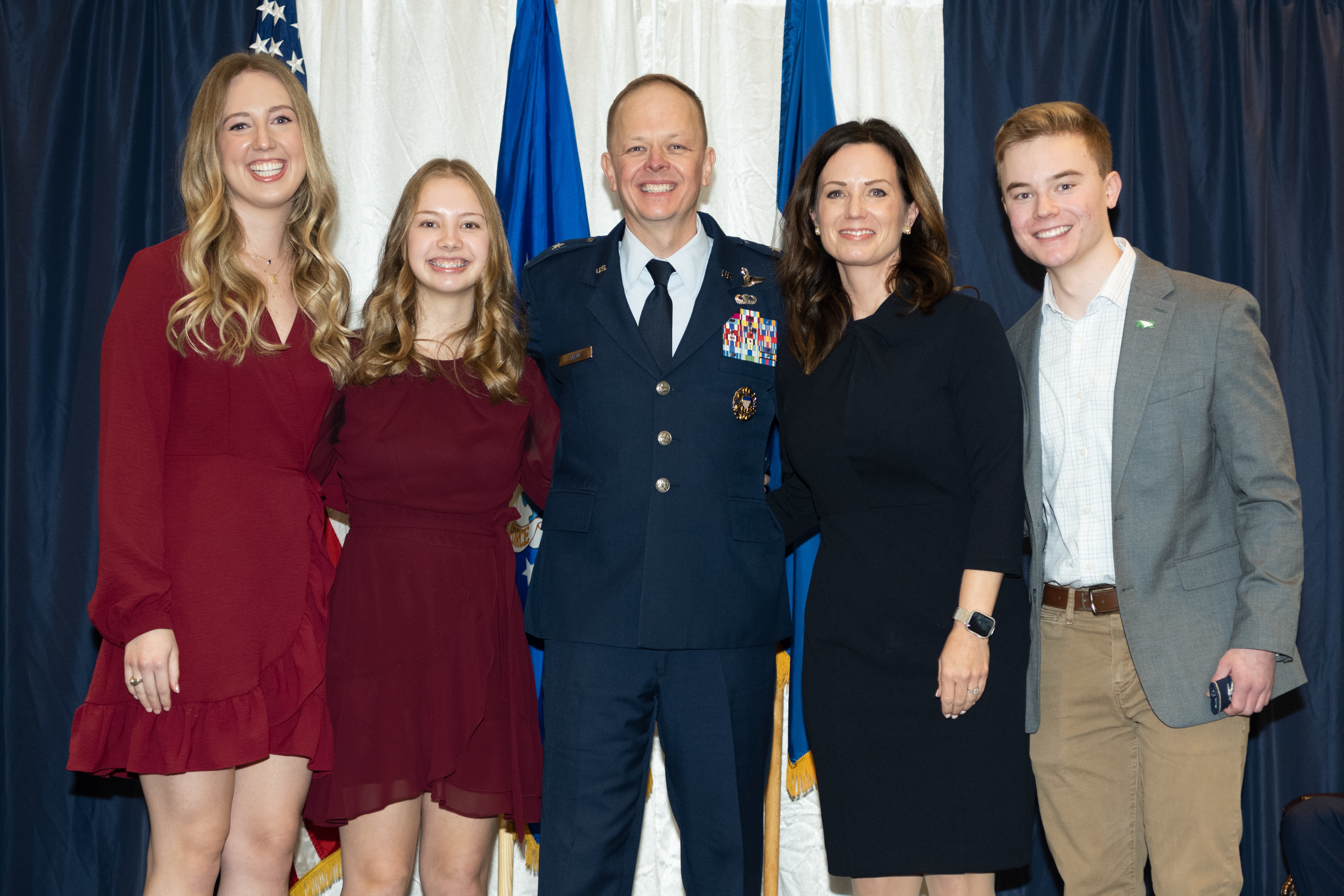 U.S. Air Force Brig. Gen. Derek Salmi, 60th Air Mobility Wing commander, poses for a photo with his family during his promotion ceremony at Travis Air Force Base, California, Jan. 4, 2024. Salmi commissioned from the U.S. Air Force Academy in 1998 after earning a Bachelor of Science degree in political science. He is a command pilot with more than 3,000 flight hours and has deployed in support of Operations ENDURING FREEDOM, IRAQI FREEDOM and NEW DAWN. (U.S. Air Force photo by Chustine Minoda)