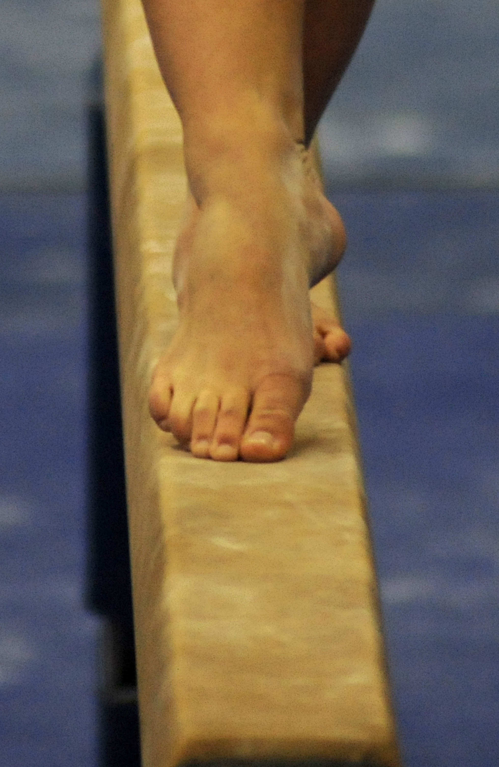 The feet of a gymnast atop the beam during the Mountain Pacific Sports Federation Championships in Davis, Calif., March 24. (U.S. Air Force photo/ Staff Sgt. Liliana Moreno)