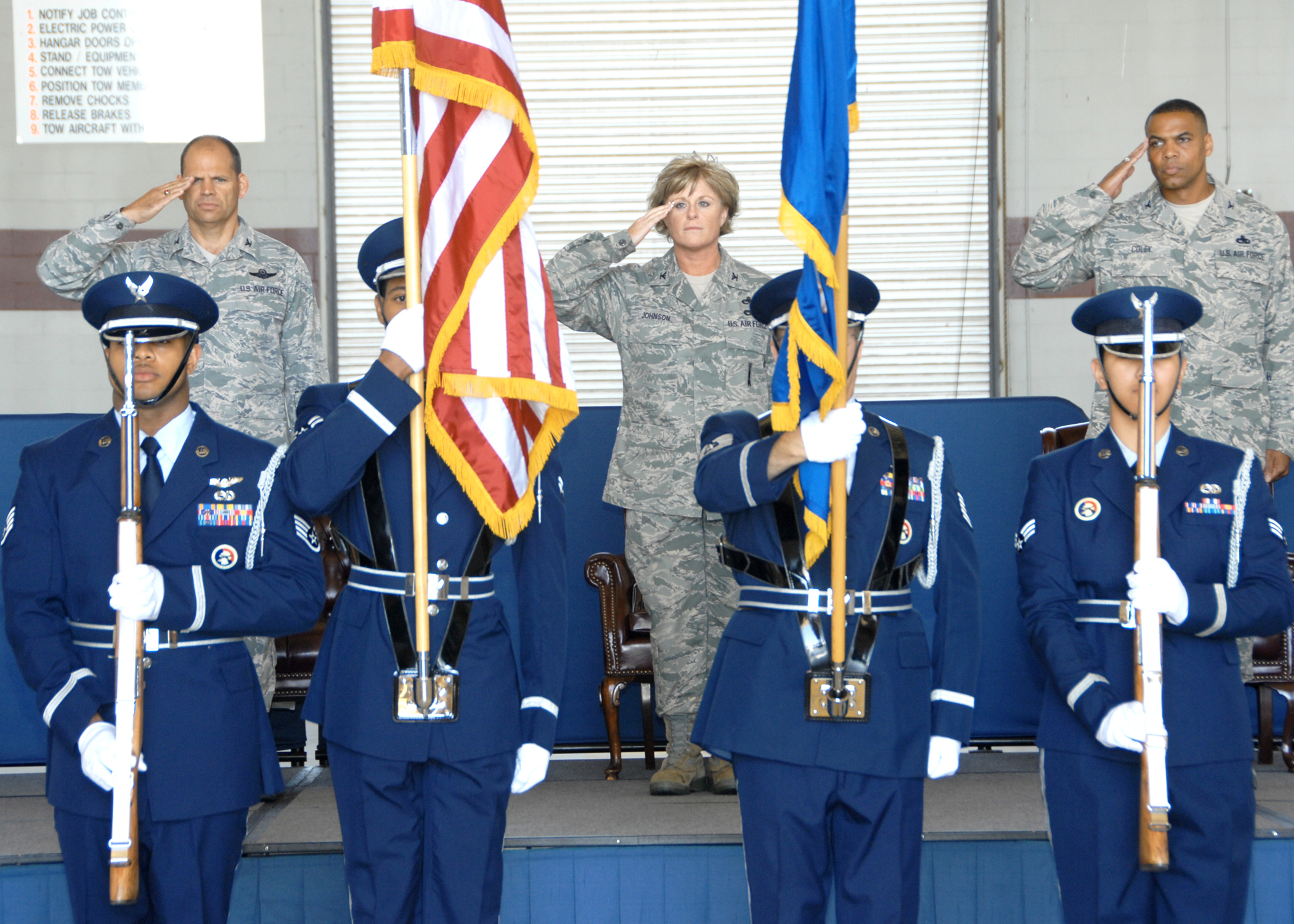 The Travis Honor Guard present the colors at the 60th Maintenance Group change of command while left to right, Colonel James Vechery, 60th Air Mobility Wing commander, Colonel Carol Johnson, outgoing 60th Maintenance Group commander and Colonel David Coley, incoming 60th Maintenance Group commander, salute the flag during the national anthem on the 7th of July 2010 at Travis Air Force Base, California. (U.S. Air Force photo by Civ/Nan Wylie)