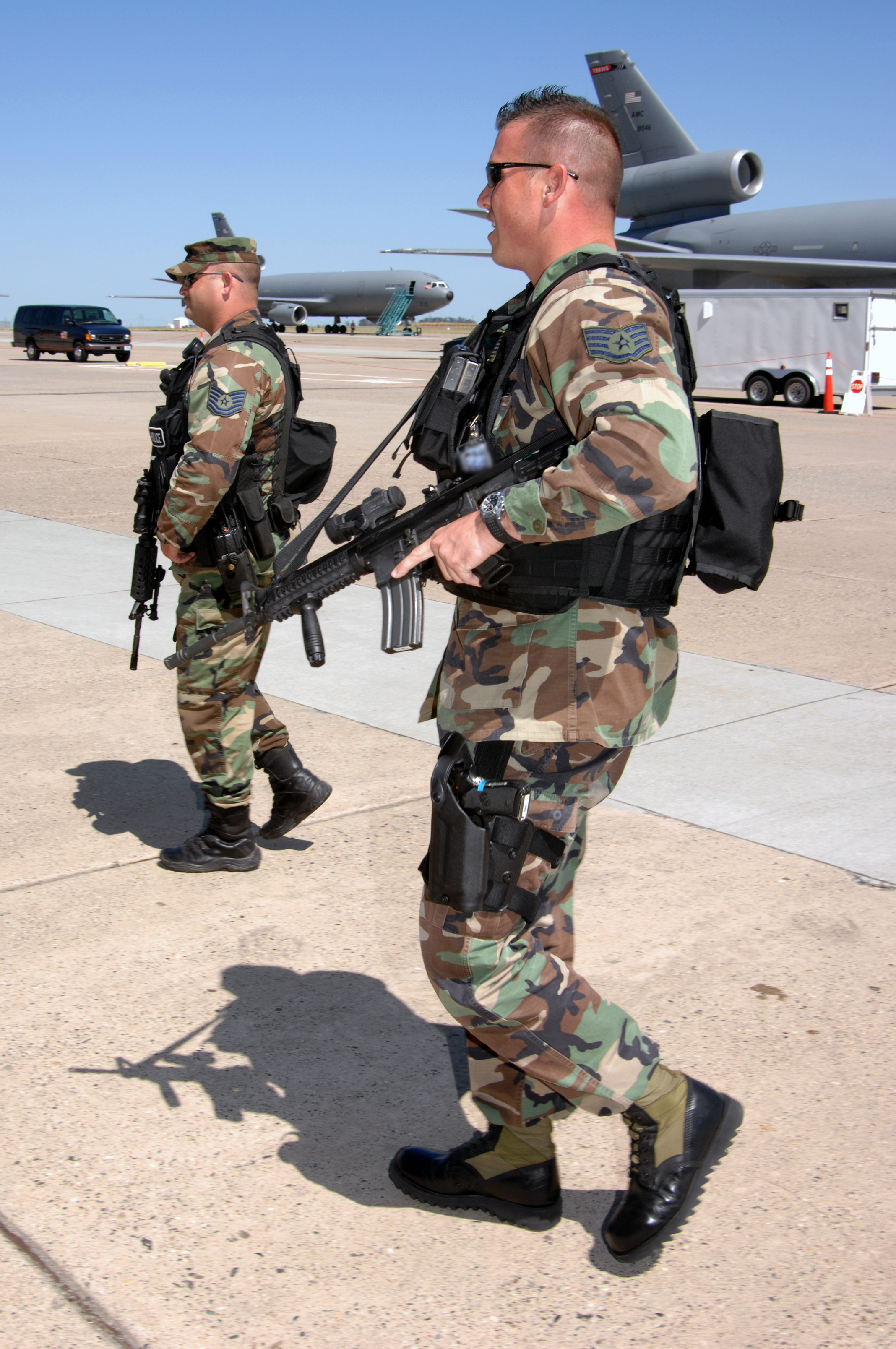 Staff Sgt. Robert Teames (foreground) and Tech. Sgt. Tyler Brown (background), both with the 60th Security Forces Squadron at Travis Air Force Base, Calif. respond during the recent exercise Crisis Fury 07-03. This exercise tested their ability to apprehend unauthorized individuals on the flight line at Travis Air Force. (USAF Photos by Laura Fentress)