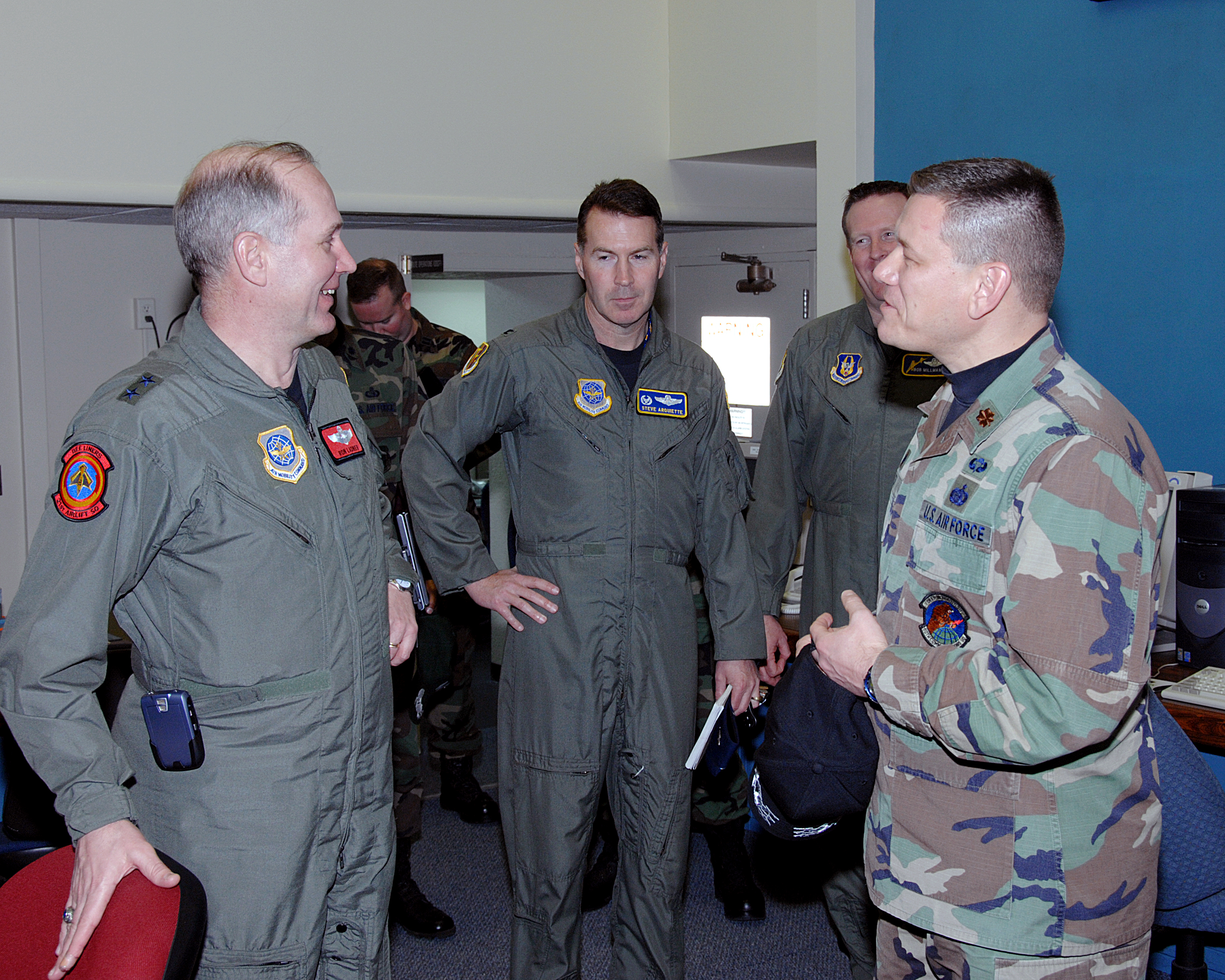 Maj. Reginald Ash, 60th Communications Squadron commander, briefs Maj. Gen. Ronald Ladnier, commander of the 18th Air Force Tanker Airlift Control Center, Scott Air Force Base, Ill., on the status of the Alternate Tanker Airlift Control Center. (U.S. Air Force photo by David Cushman)