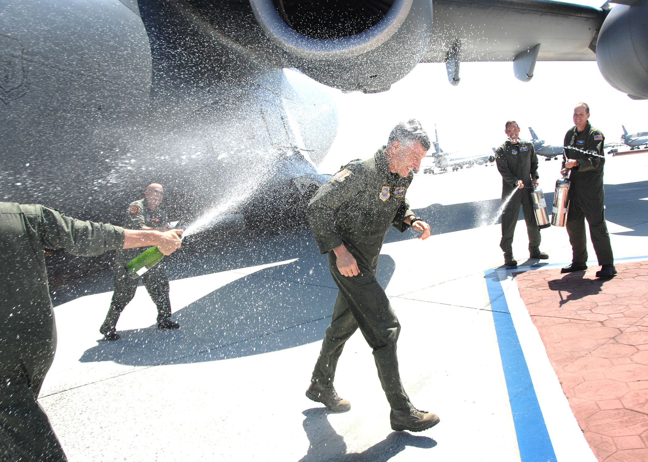 Colonel James M. Baron, Commander 60th Operations Group, Travis Air Force CA, receives a wet welcome after returning from his final local flight on May 27th, 2009. (U.S. Air Force photo by Civ/Amanda Lopez)