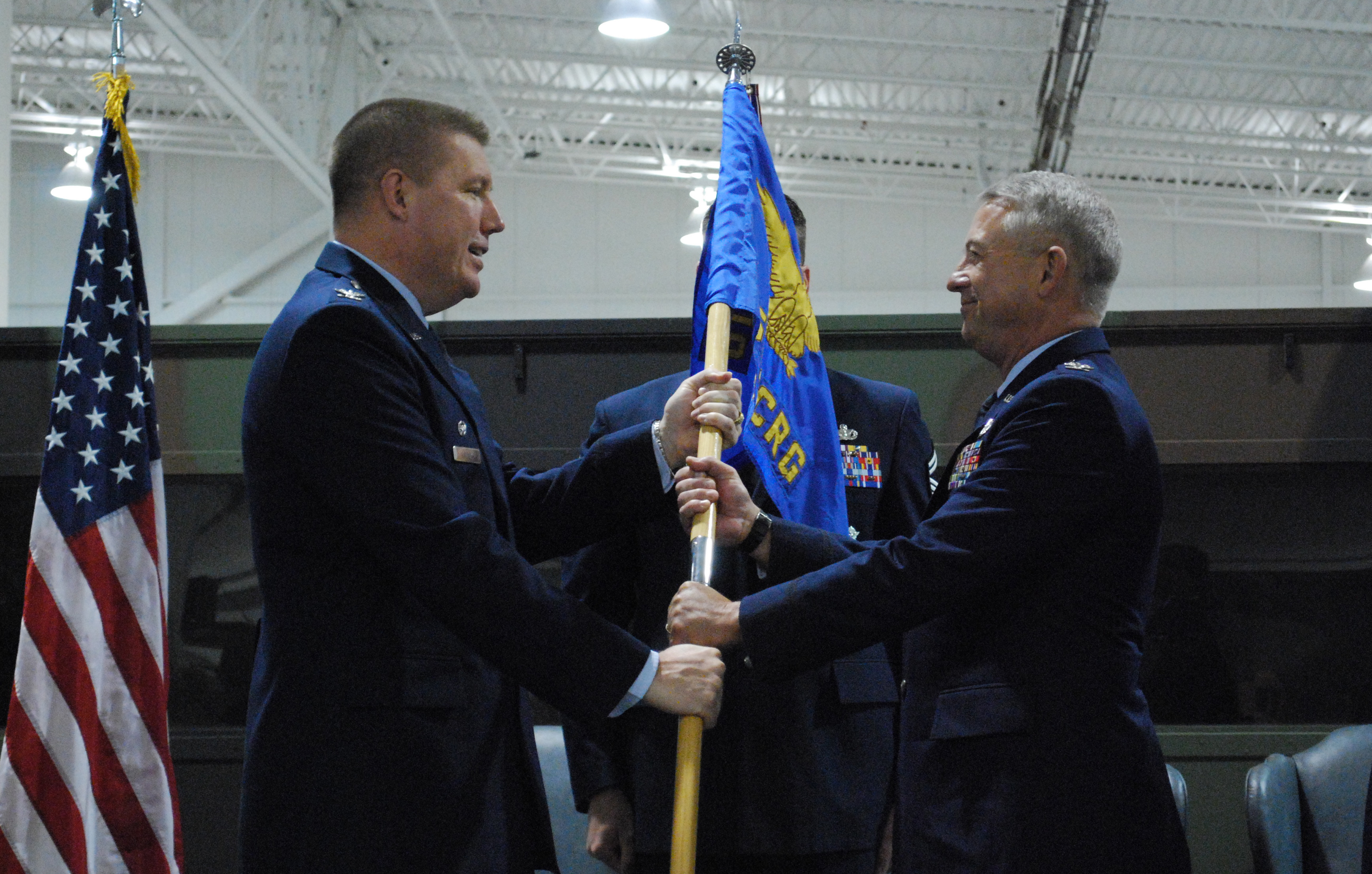 Col. Quintin Hartt, Jr., right, assumes command of the 572nd Contingency Response Group by accepting the guideon from Col. John Lipinski, 615th Contingency Response Wing commander, during a change-of-command ceremony March 31 at the 615th CRW's Global Reach Deployment Center. (U.S. Air Force photo/1st Lt. Nicole Langley)