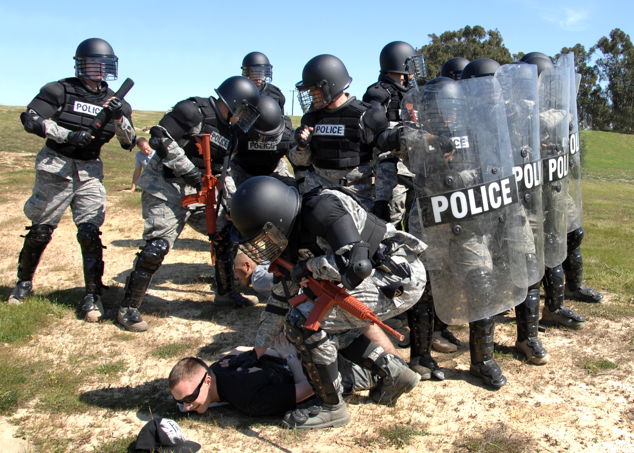 At Travis Air Force Base, California 60th Security Forces Squadron members participate in two weeks of training using non lethal and use of force procedures during various scenarios ranging from peaceful to violent demonstrations. Here, an aggressive protestor played by Airman First Class Rimmon Fay attempts to break the established shield men formation. Immediately he is restrained by apprehension riot team members. (U.S. Air Force photo by Civ/Nan Wylie)