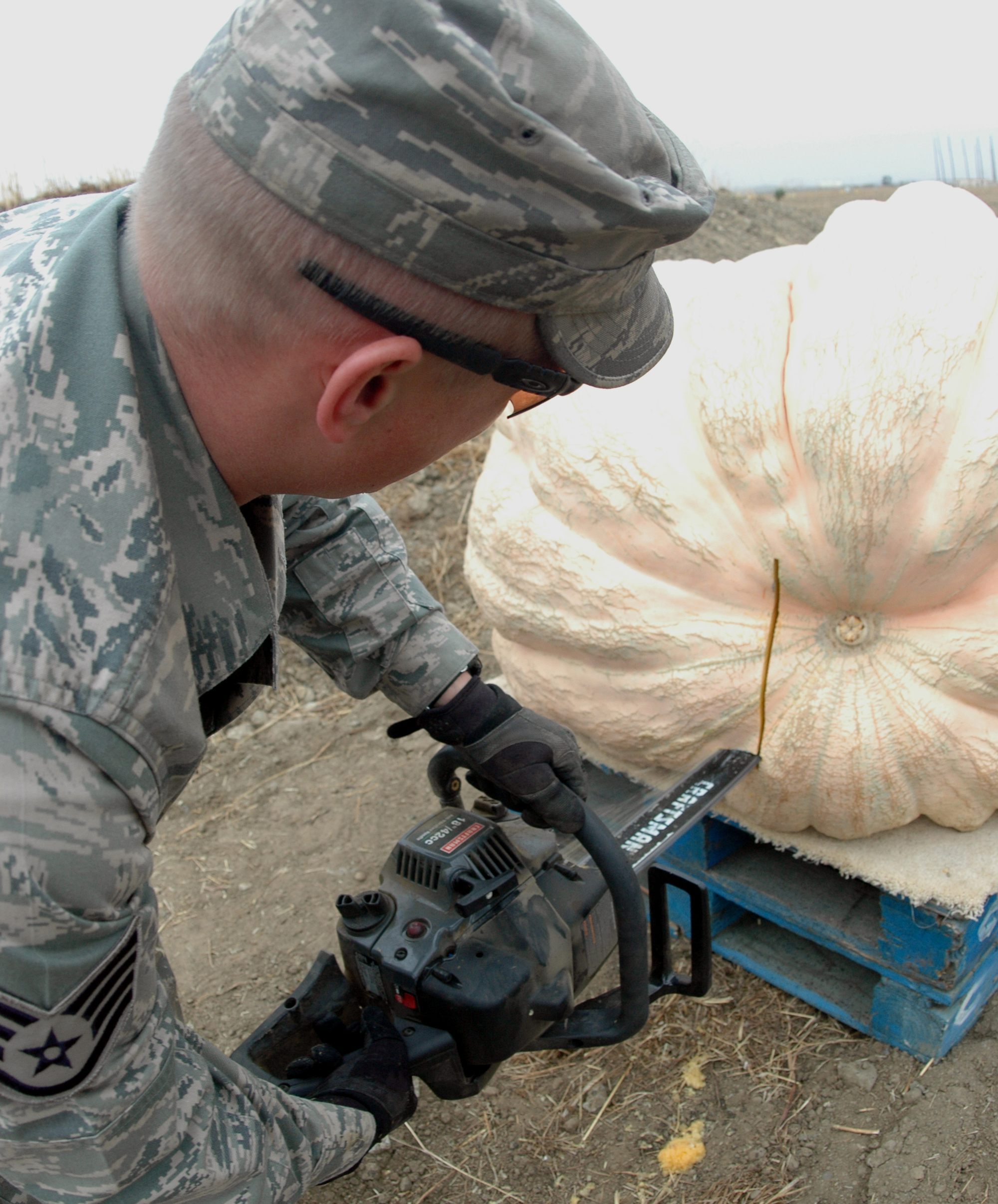 Staff Sgt. Ronnie Brickey, 60th Explosive Ordnance Disposal Team, cuts a hole in a 1,300-pound pumpkin that the team will detonate on Halloween. (U.S. Air Force photo/Staff Sgt. Shaun Emery)