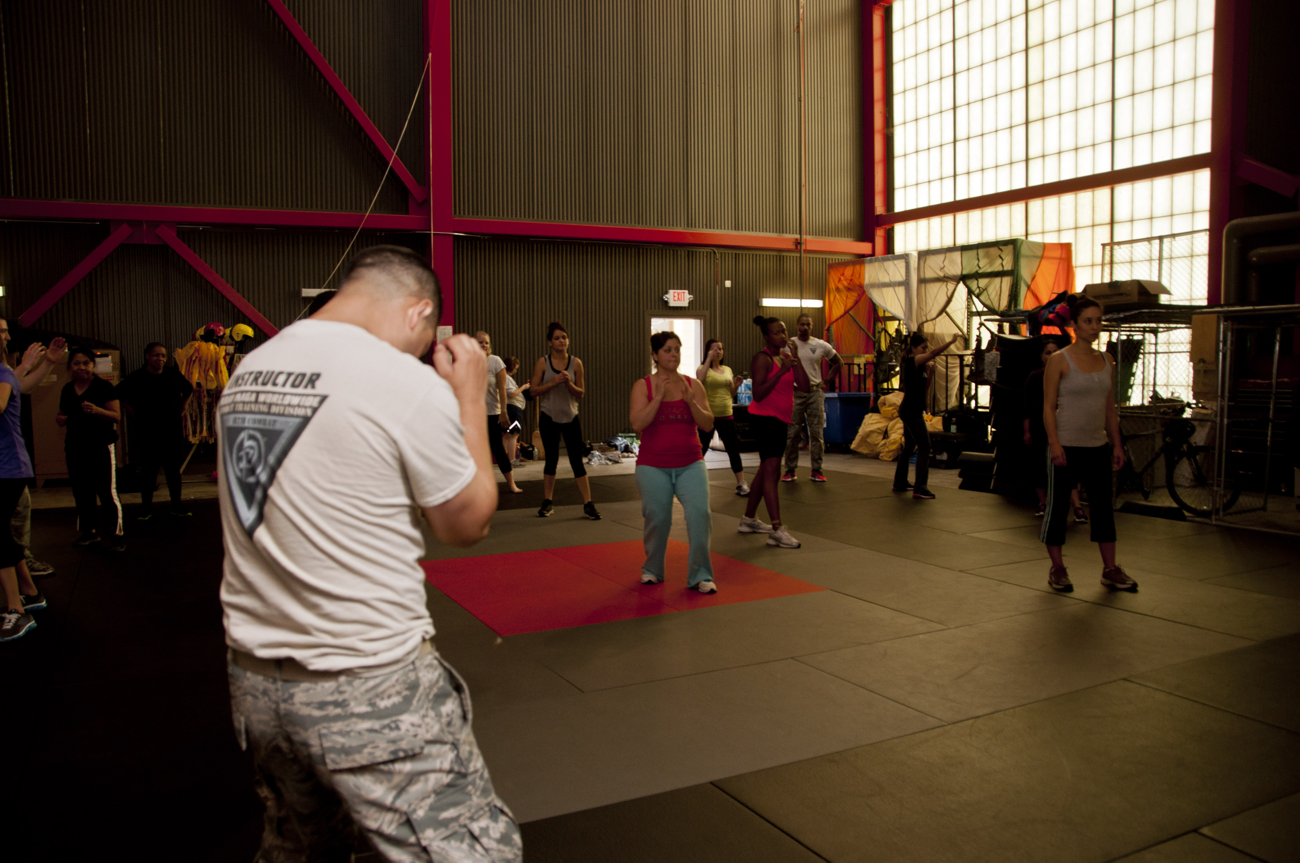 Tech. Sgt. Filiberto Rodriguez, 571st Mobility Support Advisory Squadron, teaches the basics of proper fighting stance and defensive posture May 30 to a participant of the self-protection seminar. (U.S. Air Force photo/Senior Airman Madelyn Brown)