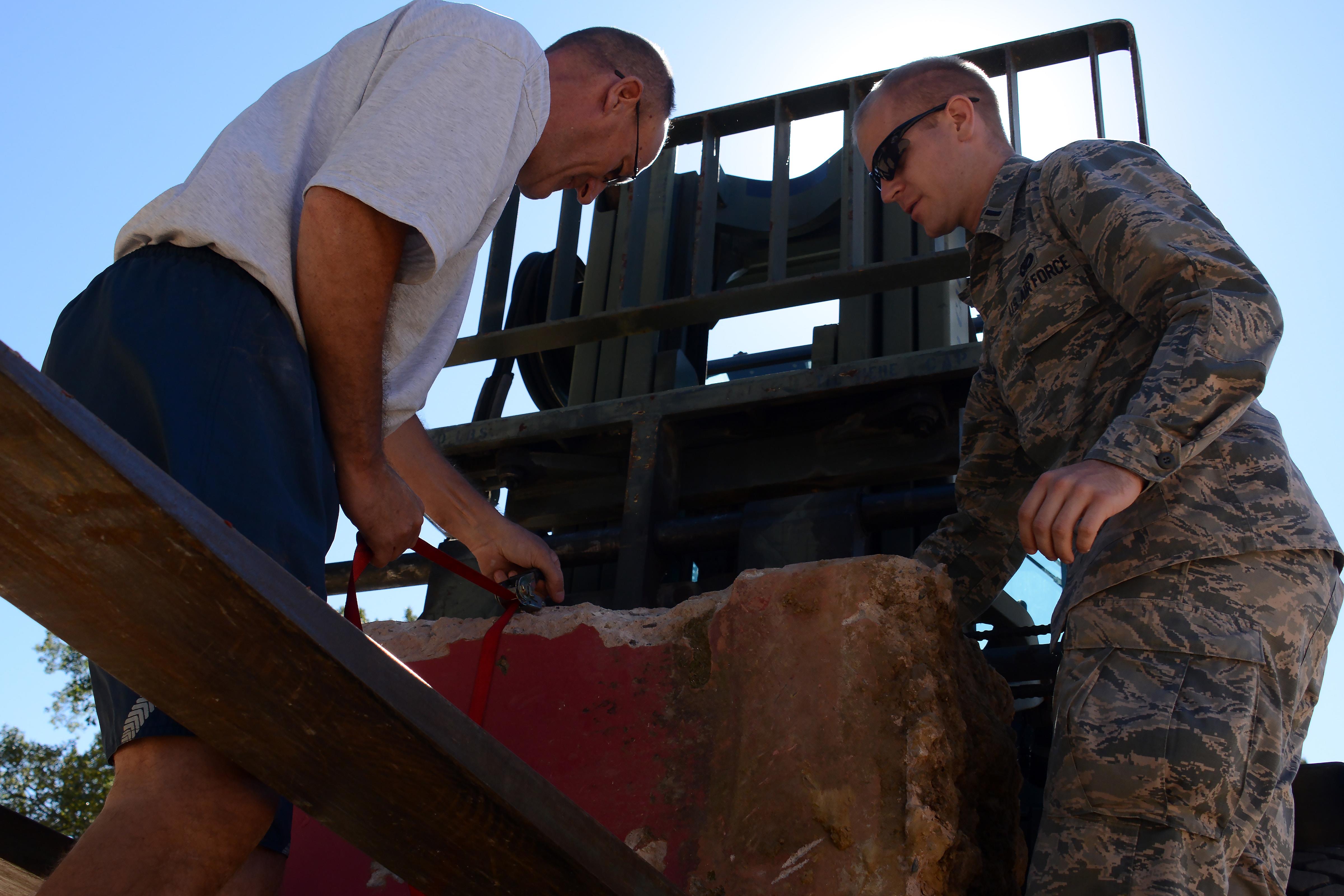 1st Lt. Mark F. Bohme, 60th Civil Engineer Squadron officer in charge of operations engineering, and Chief Master Sgt. Chris T. Burroughs, 60th Logistic Squadron fuels manager, secure the pedestal from which a plaque dedicated to Lt. Gen. Glen R. Birchard was formerly displayed, to a forklift to be relocated. The plaque will be relocated to the upcoming Travis Memorial Park in commemoration of Travis’ rich heritage of courageous Airmen. (U.S. Air Force photo by A1C Christian Conrad)