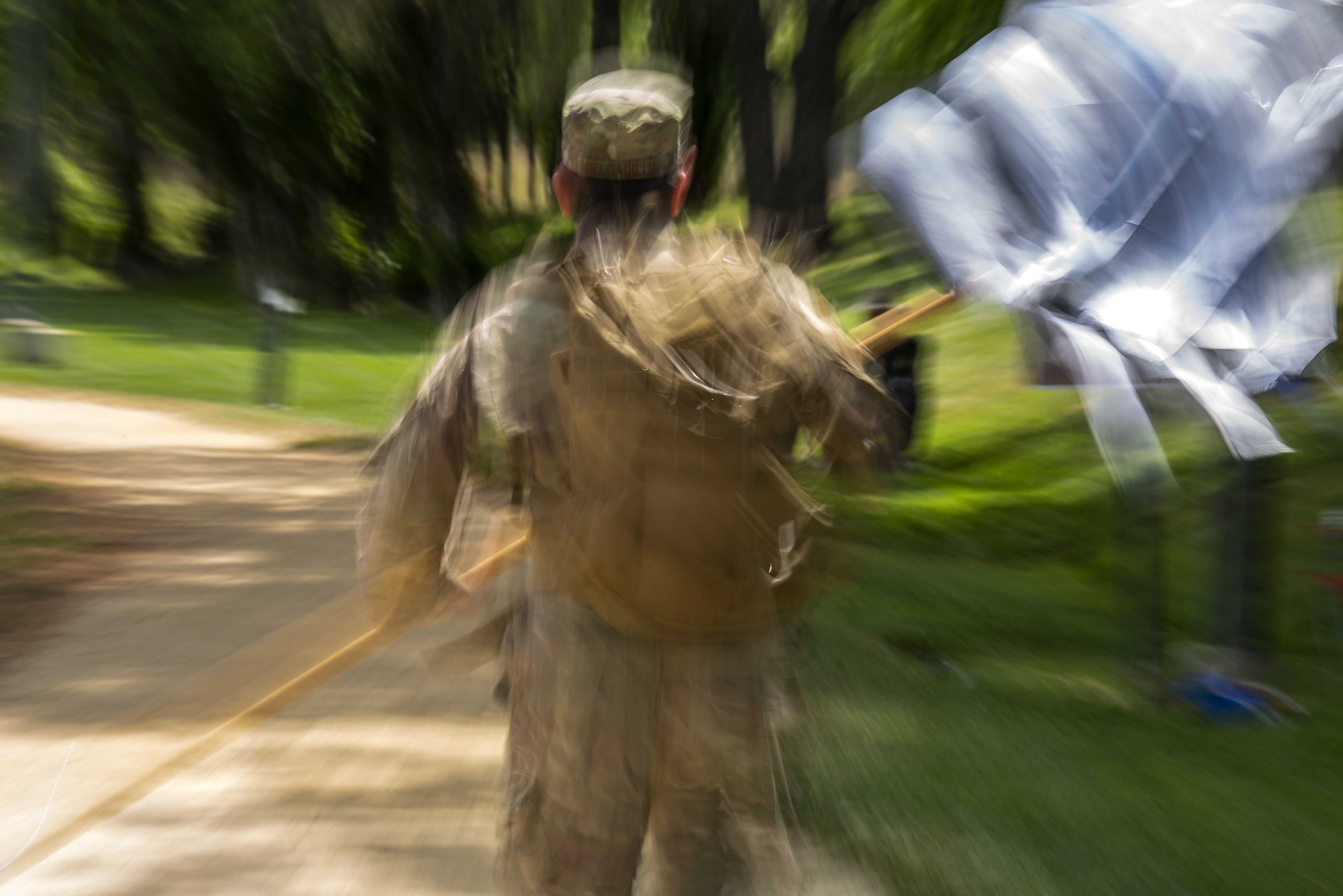 Airman 1st Class Carlos Delgadillo, 821st Contingency Response Squadron, runs with the guidon during the 24-hour ruck march at the Duck Pond on Travis Air Force Base, Calif. Security forces members from the 60th Air Mobility Wing and the 821st Contingency Response Group honored 13 fallen defenders with this memorial ruck march. (U.S. Air Force photo by Tech. Sgt. David W. Carbajal)